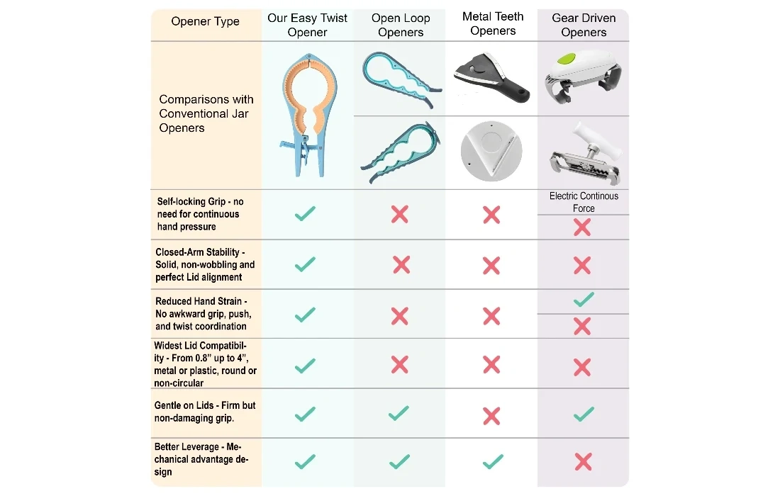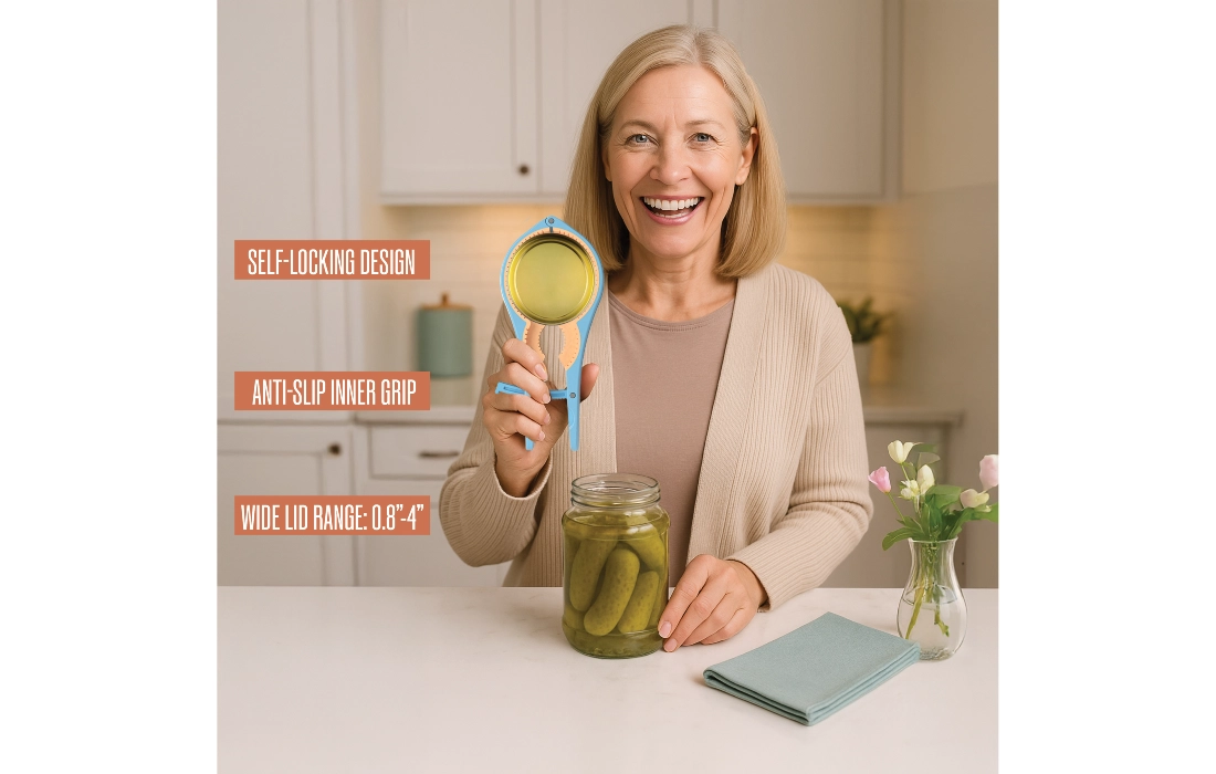 The Easy Twist Jar Opener—the first and only self-locking jar opener that grips the lids as you squeeze. Once locked in place, it stays secure, allowing you to focus your effort on twisting. Designed for better control and reduced strain, it helps make opening jars easier - especially beneficial for those with weak hands or arthritis.